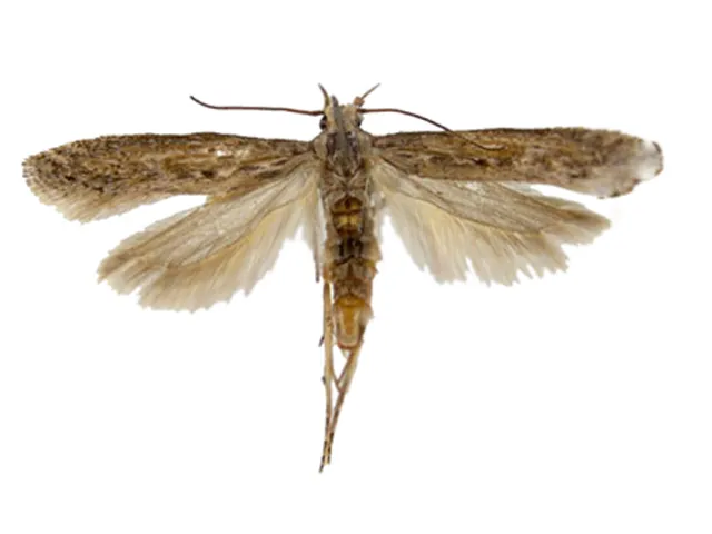 Its body is thin and long, its wings are 5-6 mm, its antennae are longer than its body. The front wings are grayish brown, with dark brown spots on the top. The mature larva is 8-10 mm long and its head and neck are brown.